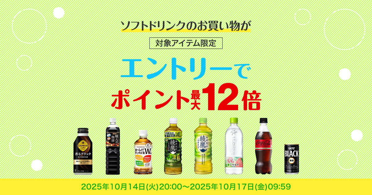 水・お茶飲料・ソフトドリンク・コーヒーがお買い得!お買い物マラソン期間中にエントリー&対象商品のご購入でポイント最大12倍!毎日飲むドリンクをお得に、お手軽に購入しましょう!