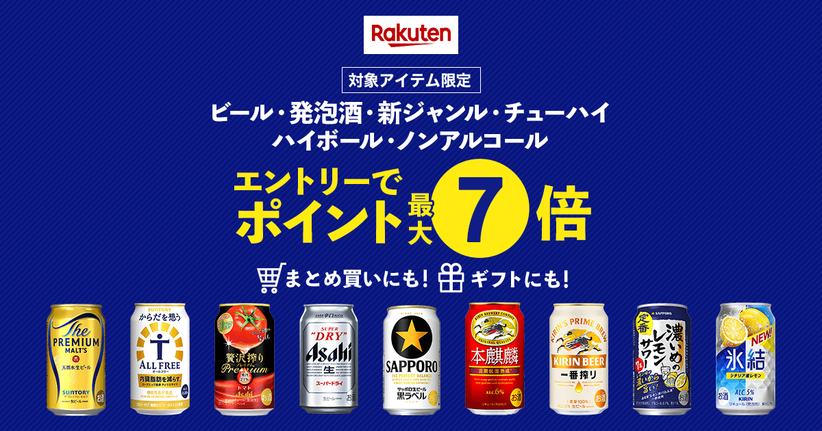 本麒麟・のどごし生・クリアアサヒ・黒ラベル・氷結などのビール・発泡酒・新ジャンル・チューハイ・ハイボール・ノンアルコールのポイント最大7倍キャンペーン実施中!楽天市場で美味しいお酒をお得にGET!