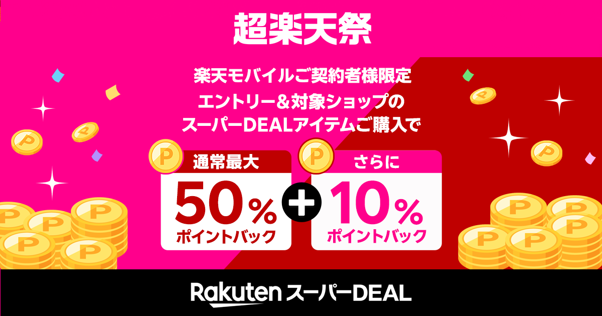 楽天モバイルご契約者様限定!エントリー&対象のスーパーDEAL対象アイテムをご購入で+10%ポイントバック!「楽天スーパーDEAL」は、楽天会員様限定の高ポイント還元サービスです。