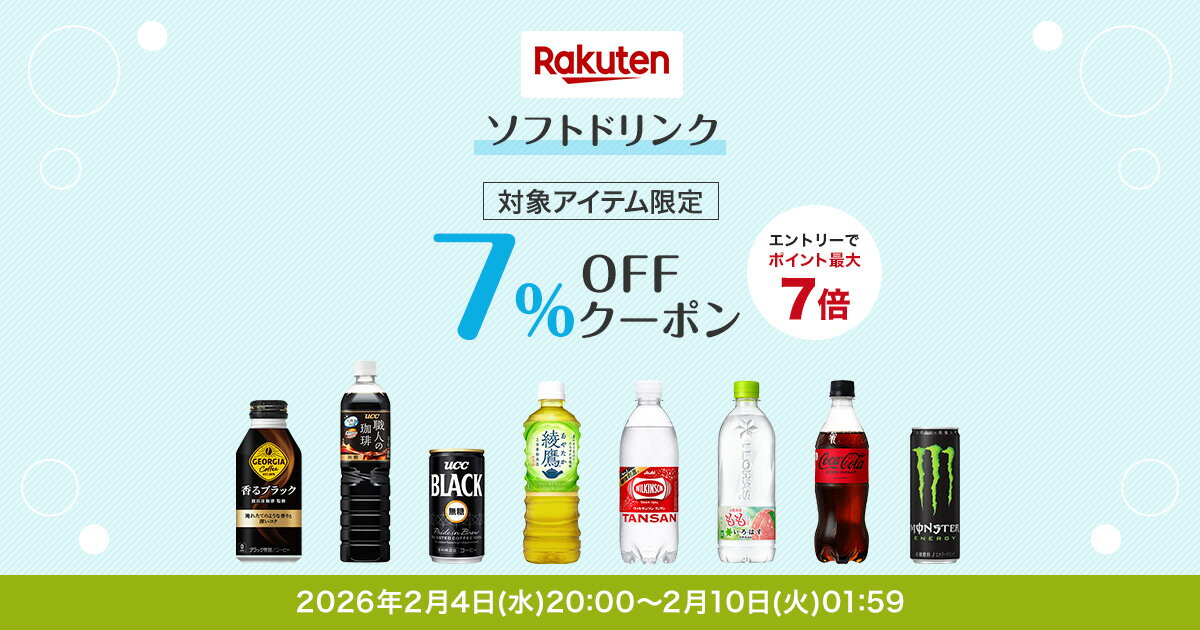 お買い物マラソン期間中、水・お茶飲料・ソフトドリンク・コーヒーで使える7%OFFクーポン配布中!さらに一部アイテムはエントリーでポイント最大7倍!毎日飲むドリンクをお得に、お手軽に購入しましょう!