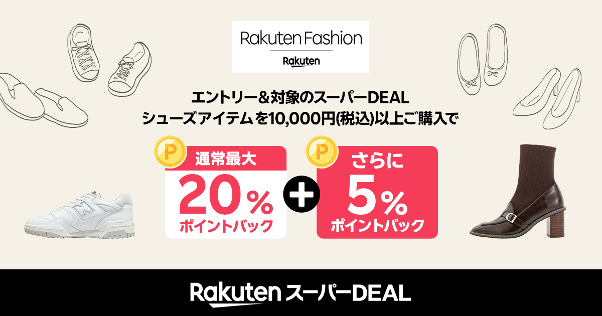 【Rakuten Fashion】エントリー&Rakuten FashionのスーパーDEAL対象シューズ商品を10,000円以上ご購入で+5%ポイントバック!「楽天スーパーDEAL」は、楽天会員様限定の高ポイント還元サービスです。