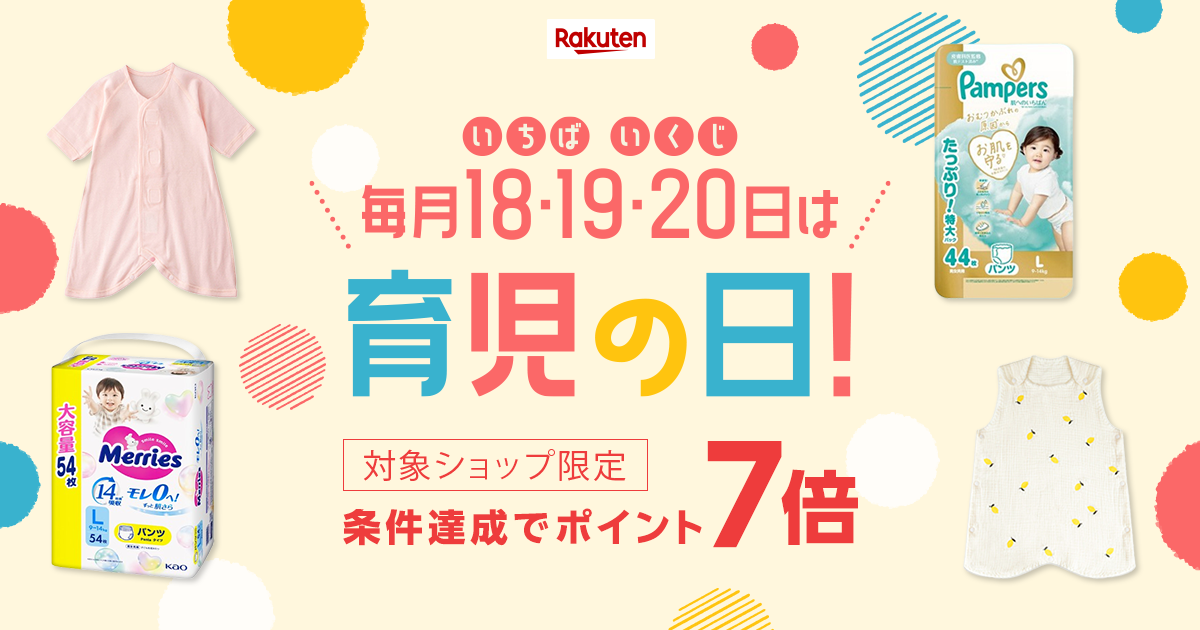 毎月18・19・20日は、楽天市場 育児の日!お得なベビー・キッズ用品をさらにポイントアップでご用意し、パパママの日頃の育児を応援します。
