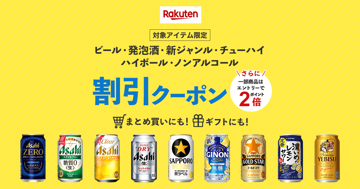 クーポン割引で本麒麟・クリアアサヒ・氷結などのビール・発泡酒・チューハイ・ハイボールなどのお酒が最大7%OFFになるキャンペーンが登場!さらにポイント2倍に!楽天市場で美味しいお酒をお得にGET!