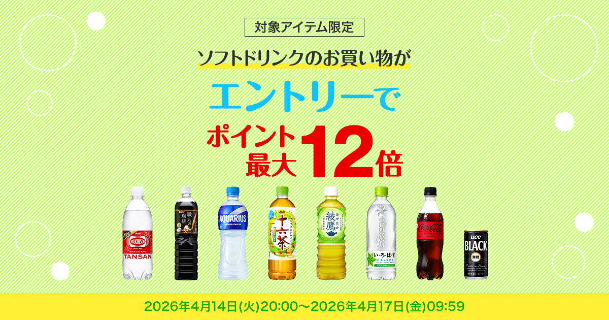 水・お茶飲料・ソフトドリンク・コーヒーがお買い得!お買い物マラソン期間中にエントリー&対象商品のご購入でポイント最大12倍!毎日飲むドリンクをお得に、お手軽に購入しましょう!