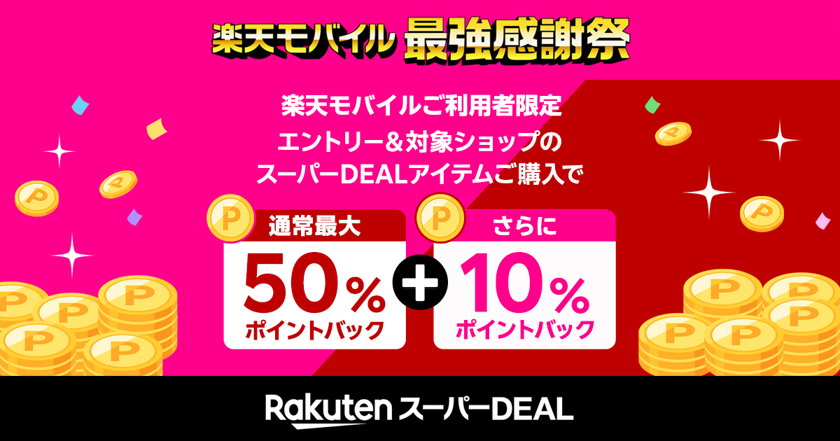 楽天モバイルご契約者様限定!エントリー&対象のスーパーDEAL対象アイテムをご購入で+10%ポイントバック!「楽天スーパーDEAL」は、楽天会員様限定の高ポイント還元サービスです。